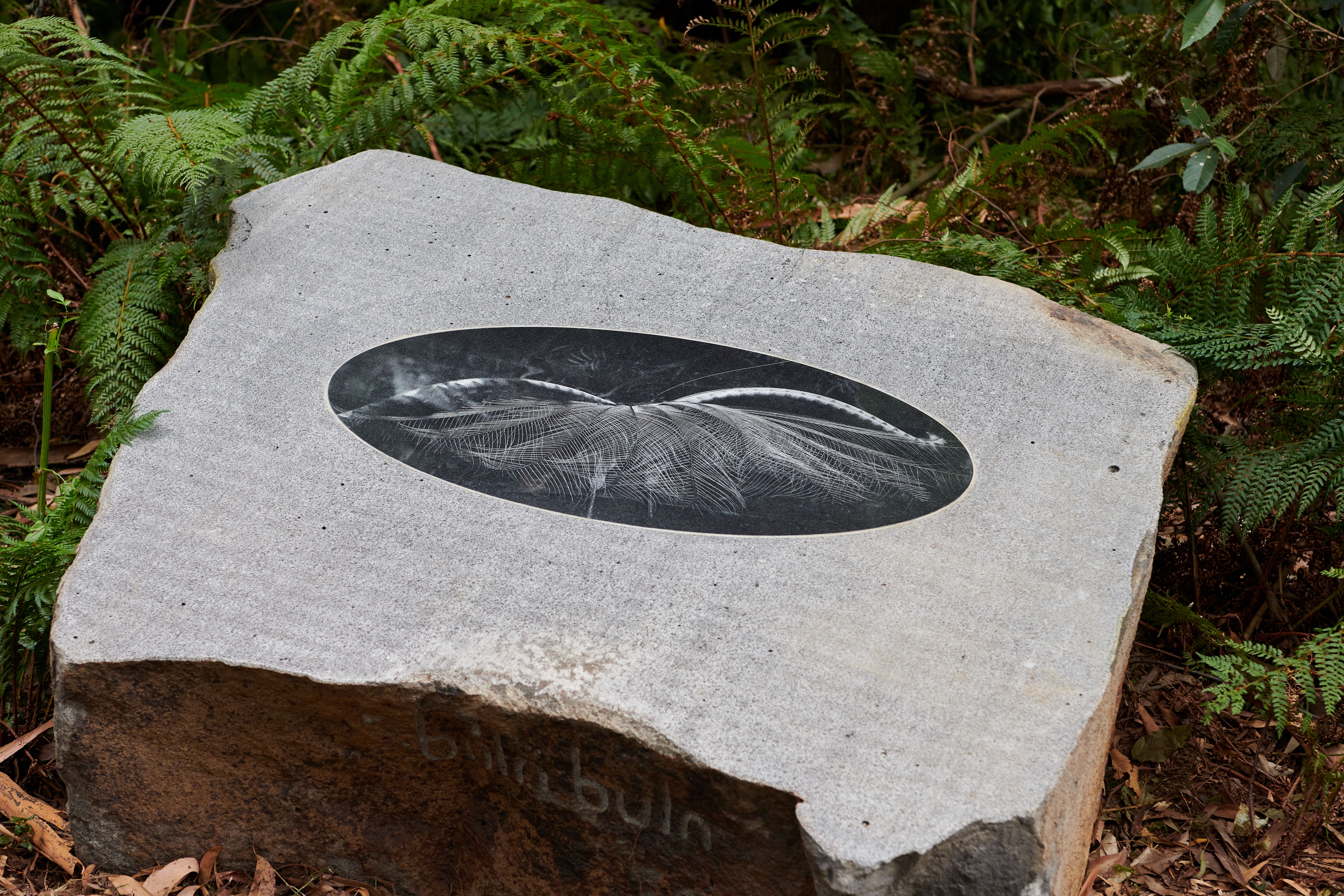 As visitors walk through the site, they gradually encounter shifting compositions of basalt boulders adorned with intricate, shimmering mosaics depicting aspects of the distinctive plants and wildlife of the area. Accompanying the imagery is a series of engraved and sandblasted text that intertwines ancient Wurundjeri knowledge with contemporary reflections on the myriad relationships that shape the forest ecosystem, from the sprawling network of fungi beneath the earth to the flight paths of birds above.