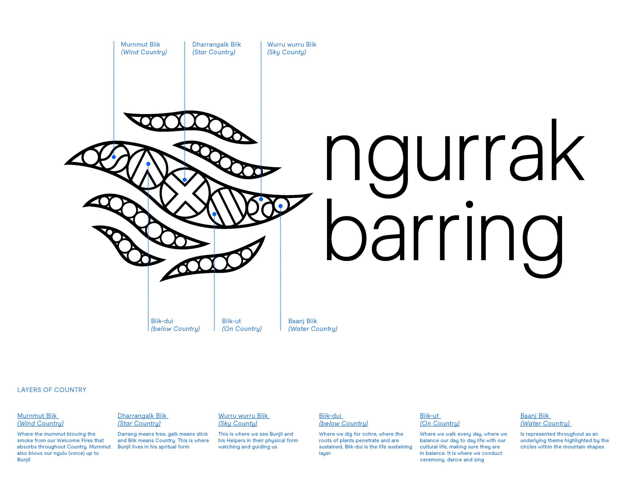 The ngurrak barring logo by Base Design is based on artwork by Wurundjeri artist Mandy Nicholson. Mandy’s artwork is inspired by the carved and painted designs of Beruk (William Barak).