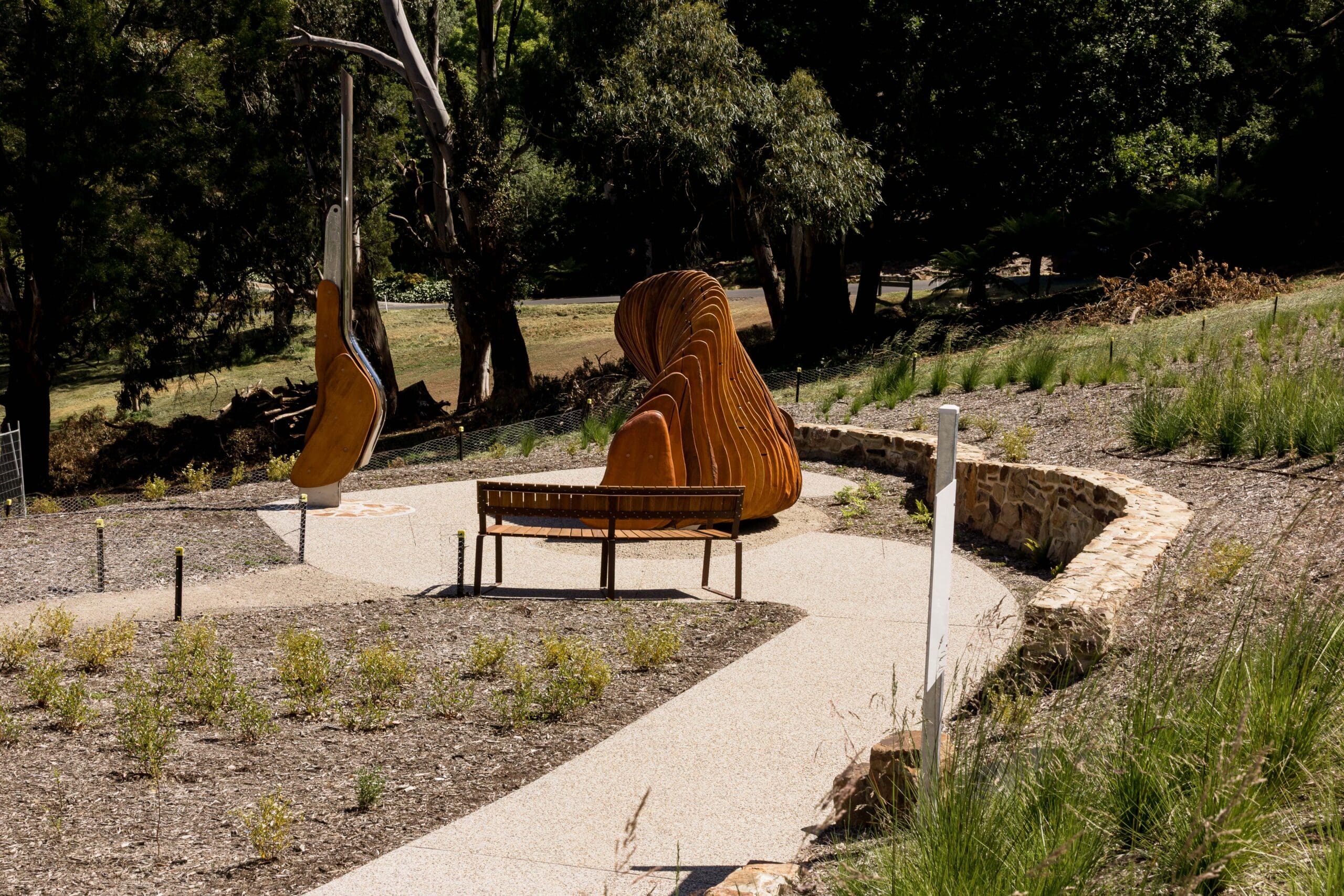 There are five Storm Leaves sculptures by Anton McMurray along ngurrak barring. Four of the five works are in areas with accessible facilities.