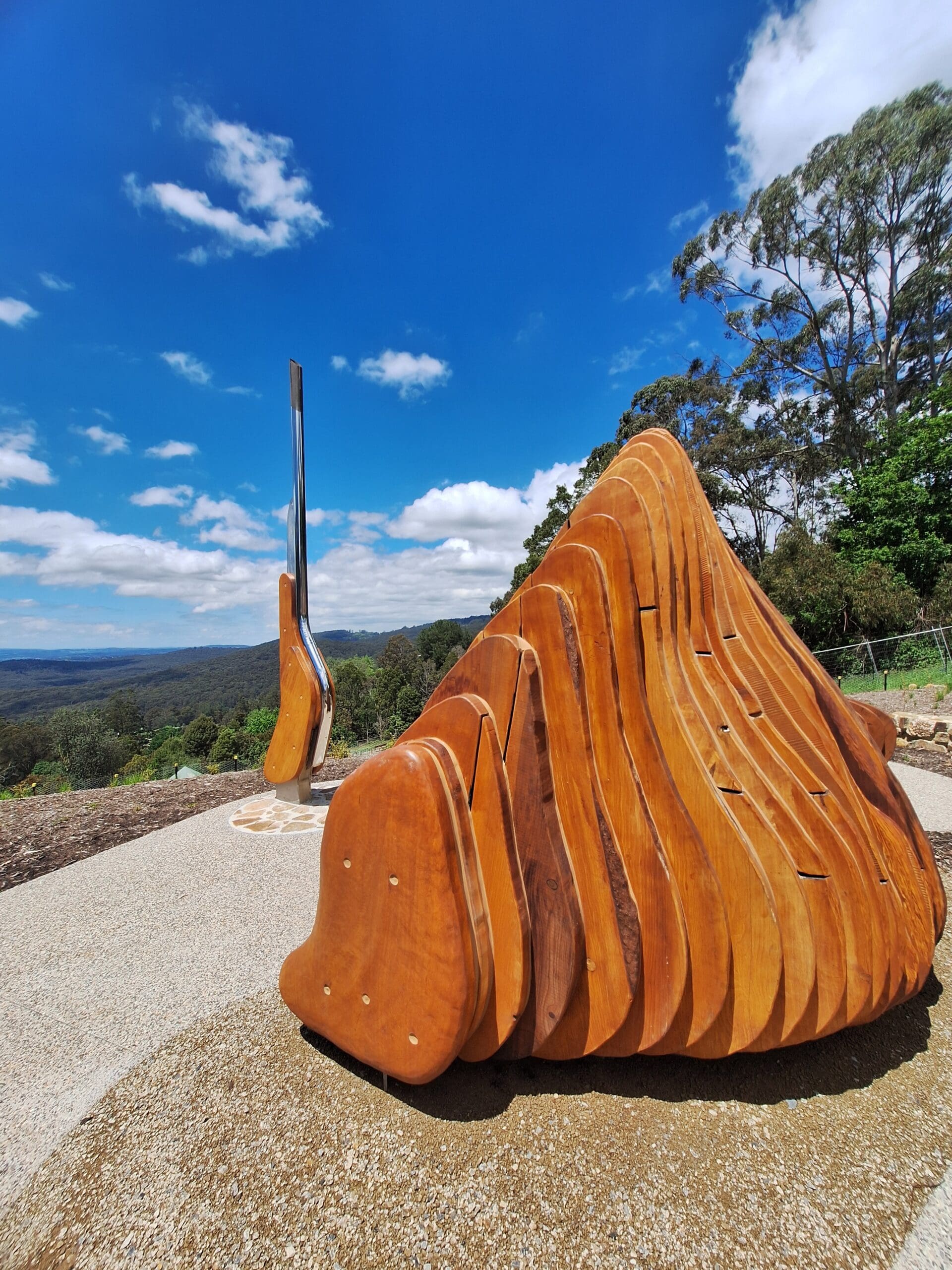 In harmony with nature’s geometry, the sculptural forms are hand-worked from fallen trees. Subtle sculpting of the land with paths and native plantings combine, creating a place of listening and looking. Carved to emerge from the earth and reaching skyward, the human-scale forms appear malleable, echoing the surroundings and the way trees and foliage sway. Like antennas, they pick up air movements, quietly relaying sounds up close and from afar.