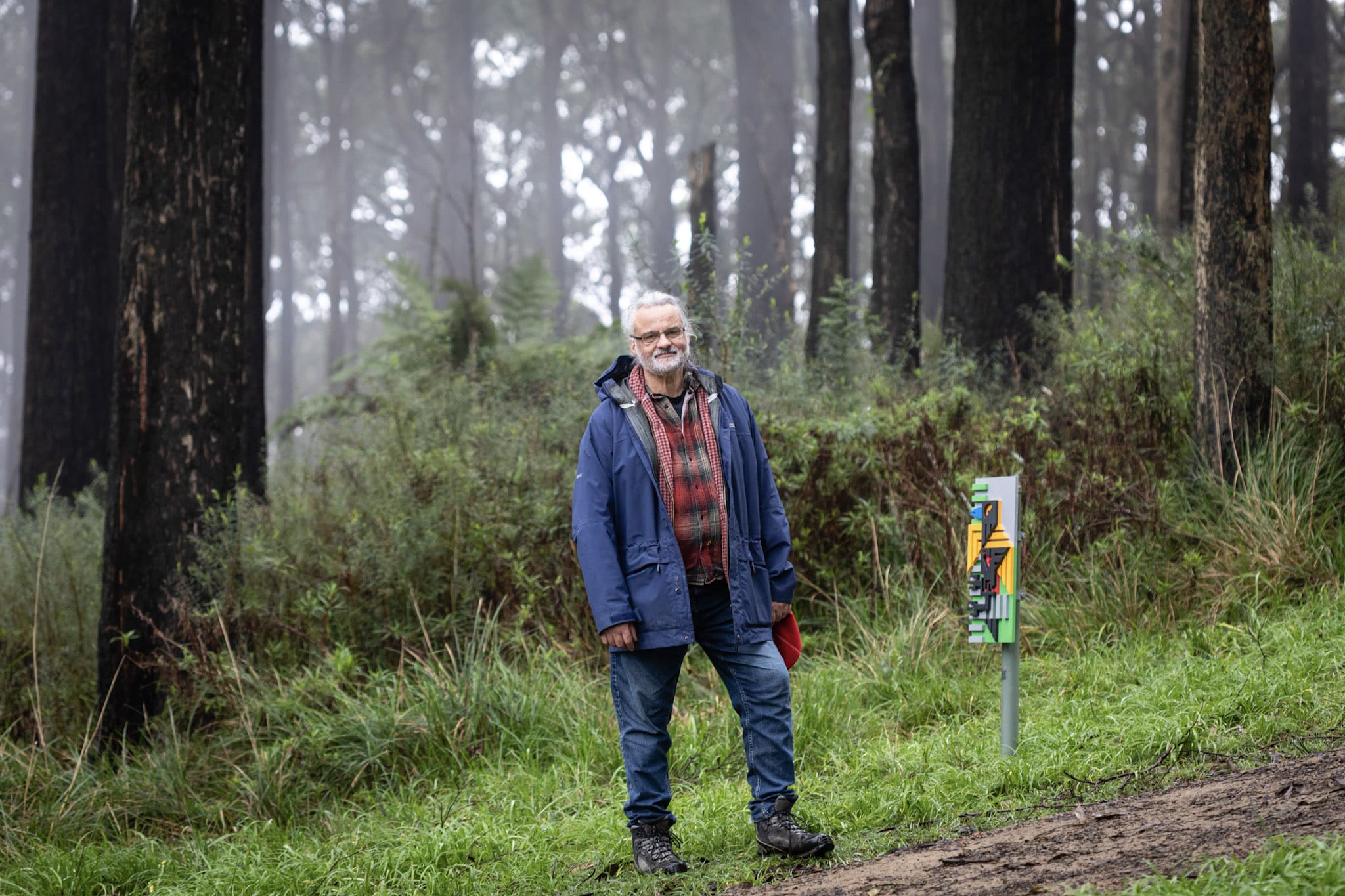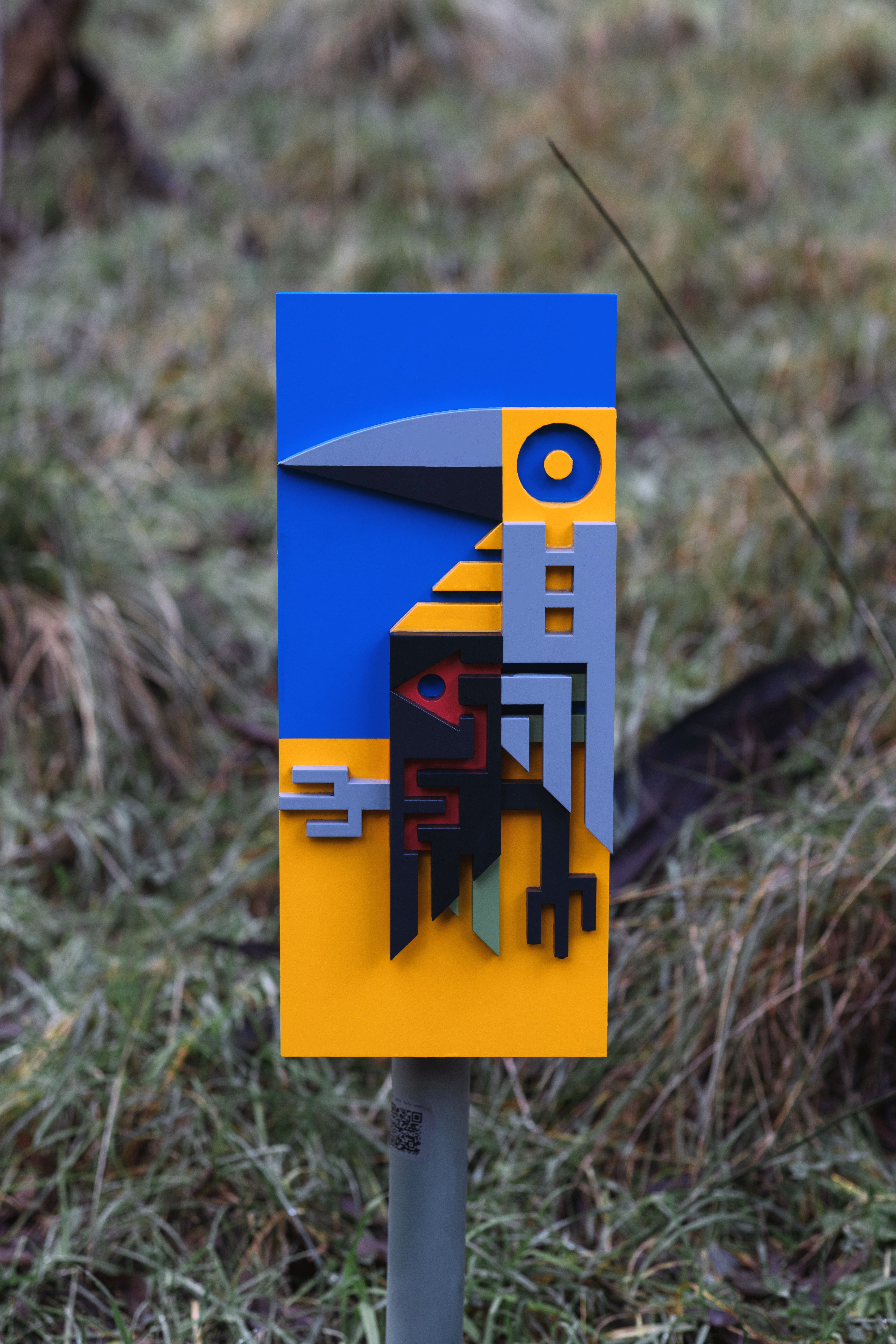 Commissioned by Yarra Ranges Council in 2022, Peter McIlwain’s series of geometric abstracted birds were installed as temporary artworks along sections of ngurrak barring until June 2025, first as part of the Sassafras Art Walk and subsequently at Birdsland Reserve. Made from digitally designed modular components representing various body parts, this bas-relief artwork draws on ancient ways of seeing (x-ray art, petroglyphs) and modern design concepts. The works presented as way-finders along the path and like the local birds, offered small bursts of colour in the bush.