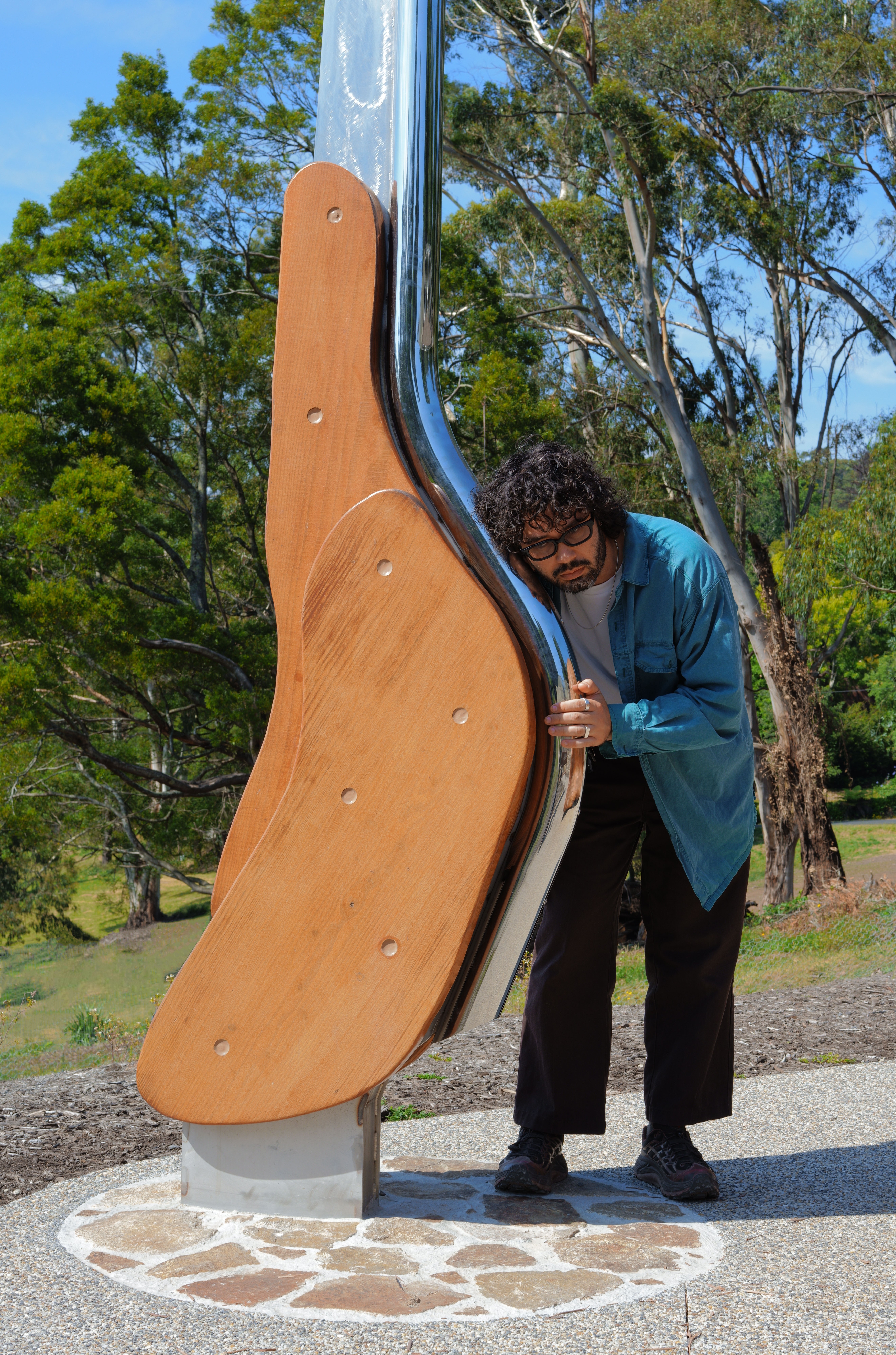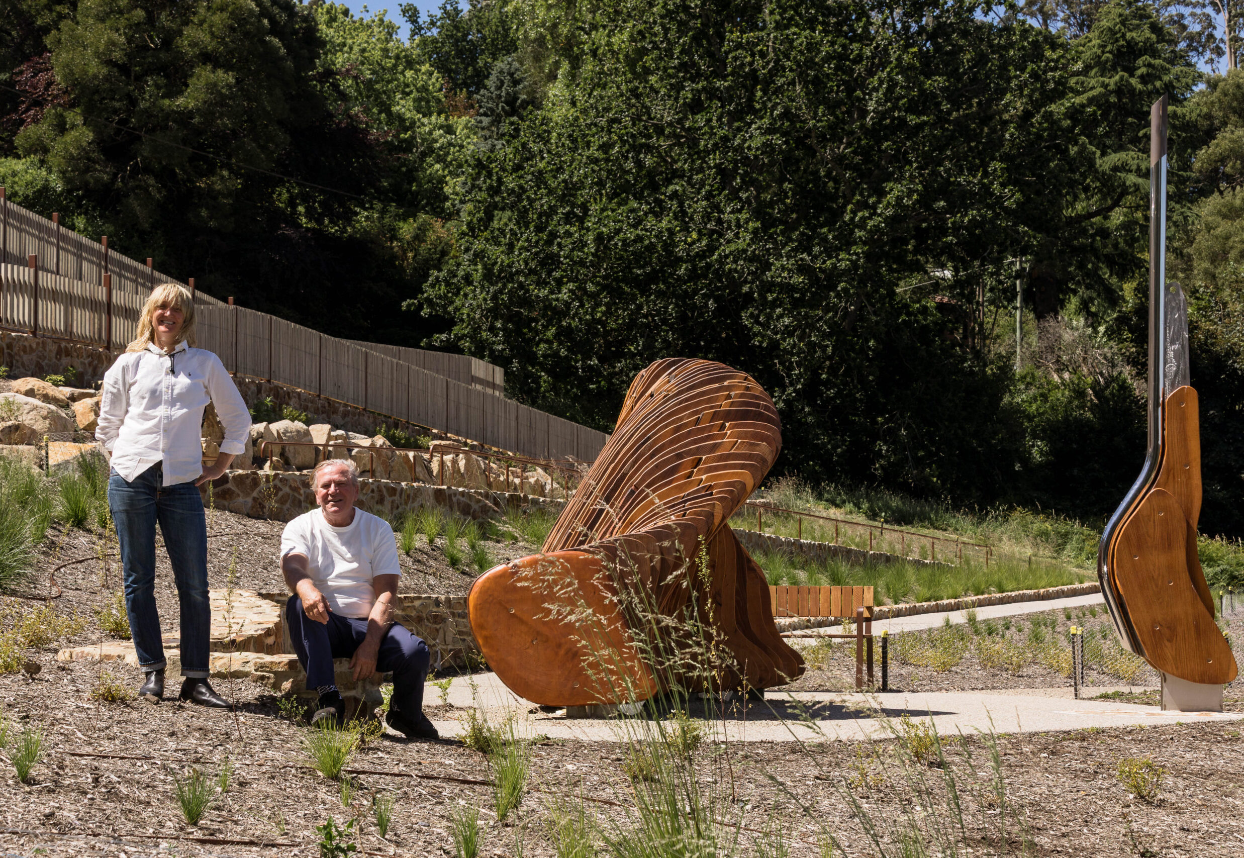 rescued timber, stainless steel, shaped earth, native planting