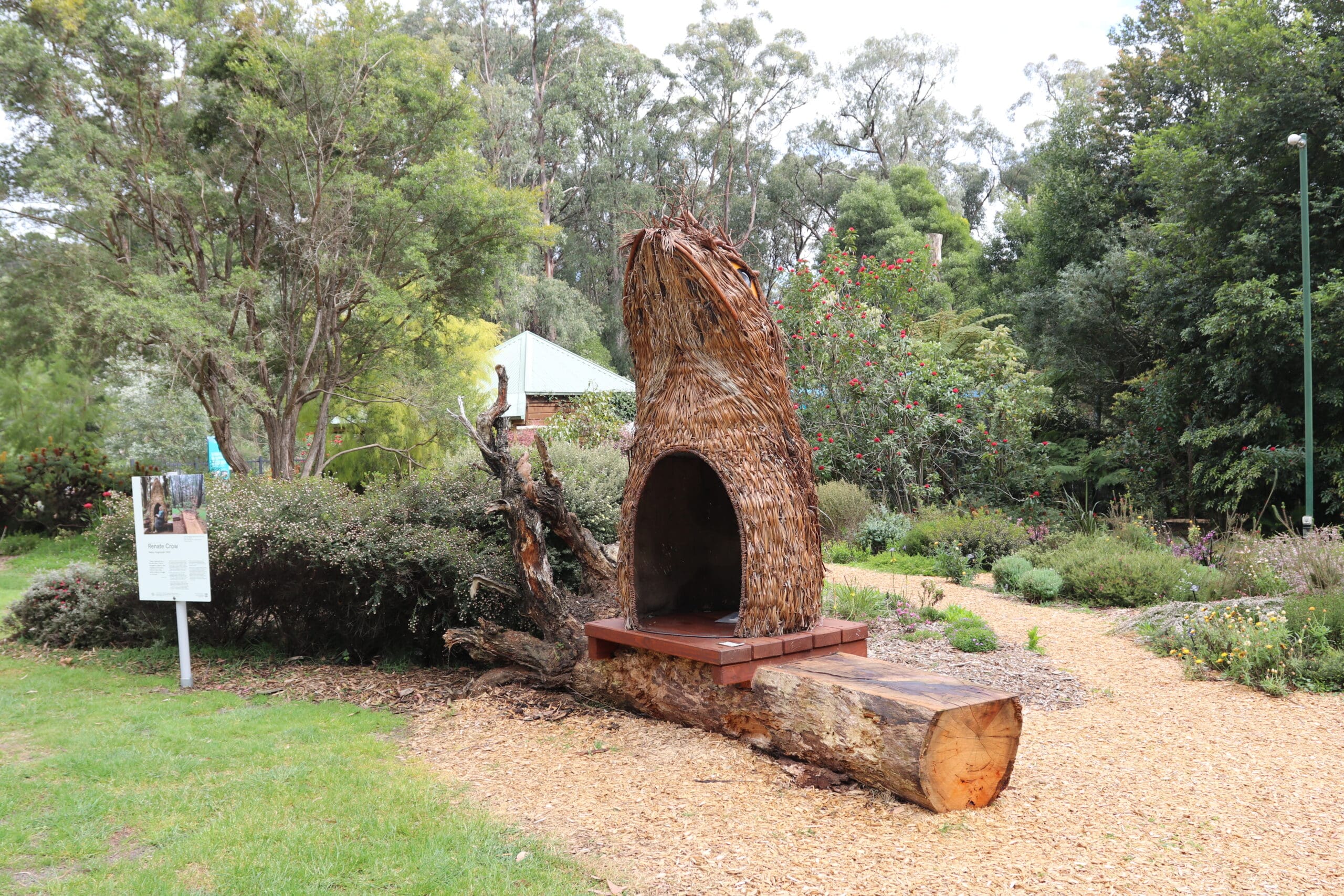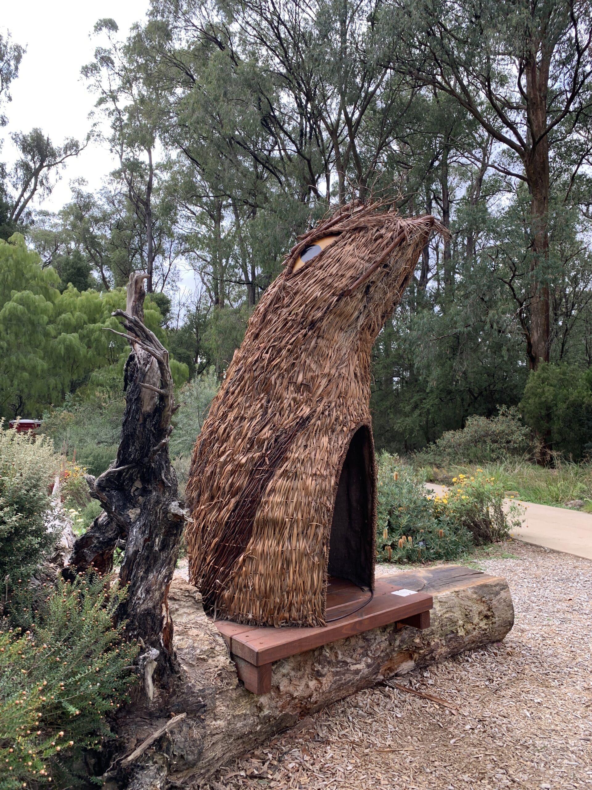 Perched upon timber from a storm-felled mountain ash, Tawny Frogmouth’s outer feathering comprises woven locally sourced natural fibres. Walkers exploring ngurrak barring can carefully sit inside Tawny’s ‘belly’: a tiny sanctuary for taking a moment to be still.