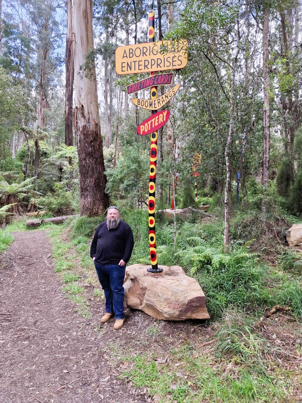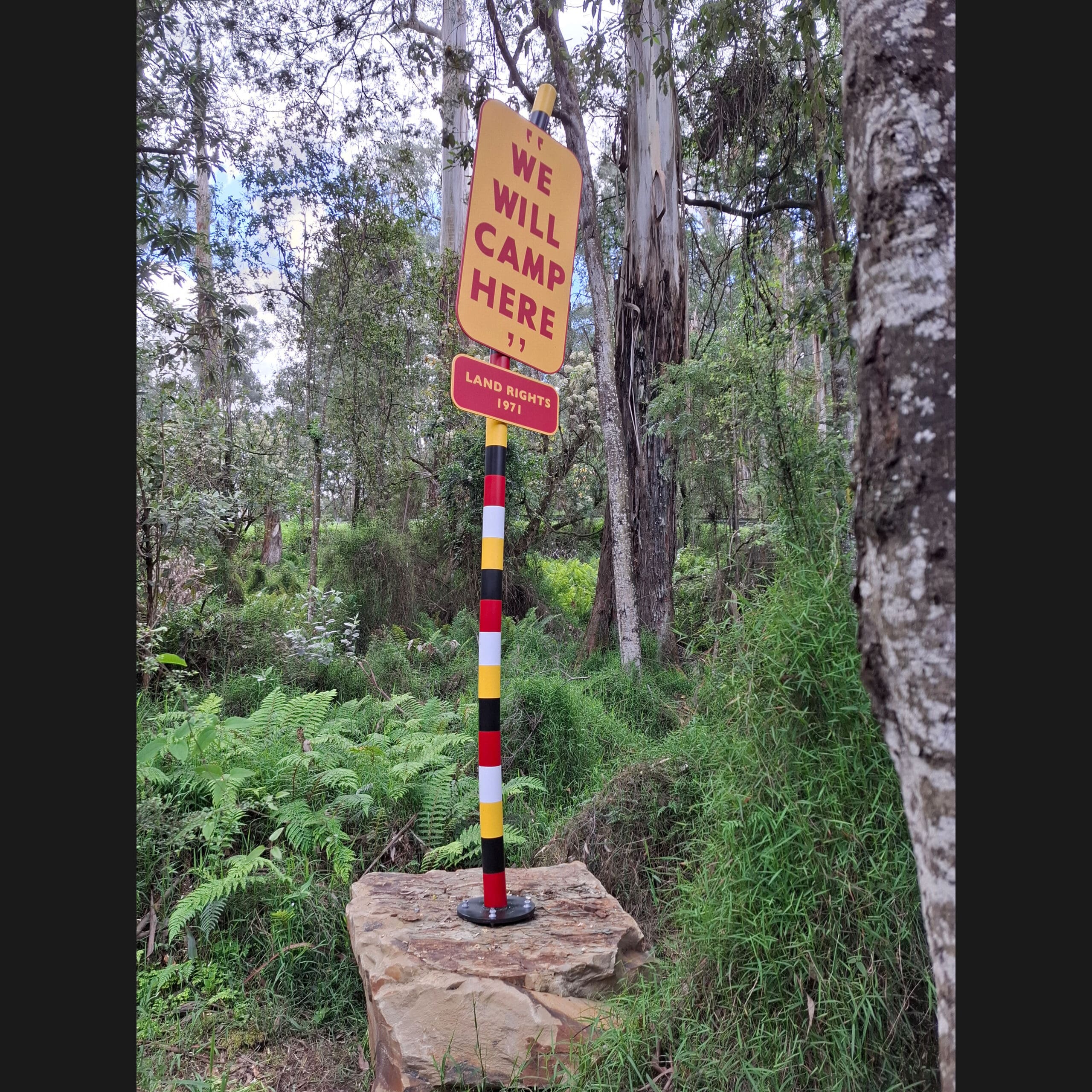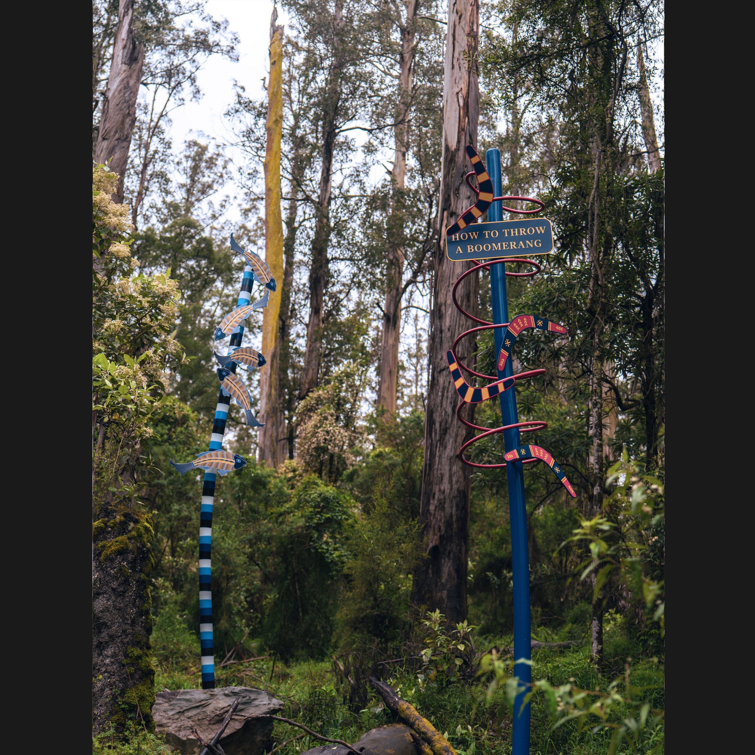 This powerful, site-responsive installation weaves together four generations of family history, activism, and creative expression that have taken place here in goranwarrabil (the Dandenong Ranges). Central to the installation are a series of sculptural signposts, each embodying a significant theme—Aboriginal Enterprises, land rights, cultural knowledge (like boomerang-throwing), ecological connections (flora, fauna, water), and Aboriginal identity. The final pole, left intentionally blank, symbolises an unwritten future, inviting reflection and a sense of possibility as well as acknowledging the next generation of the Onus family.