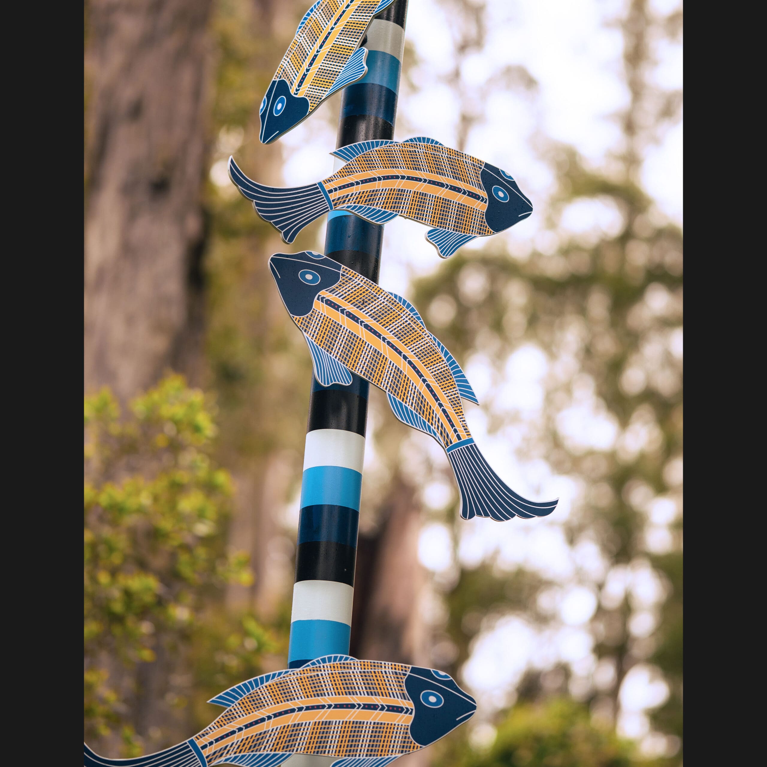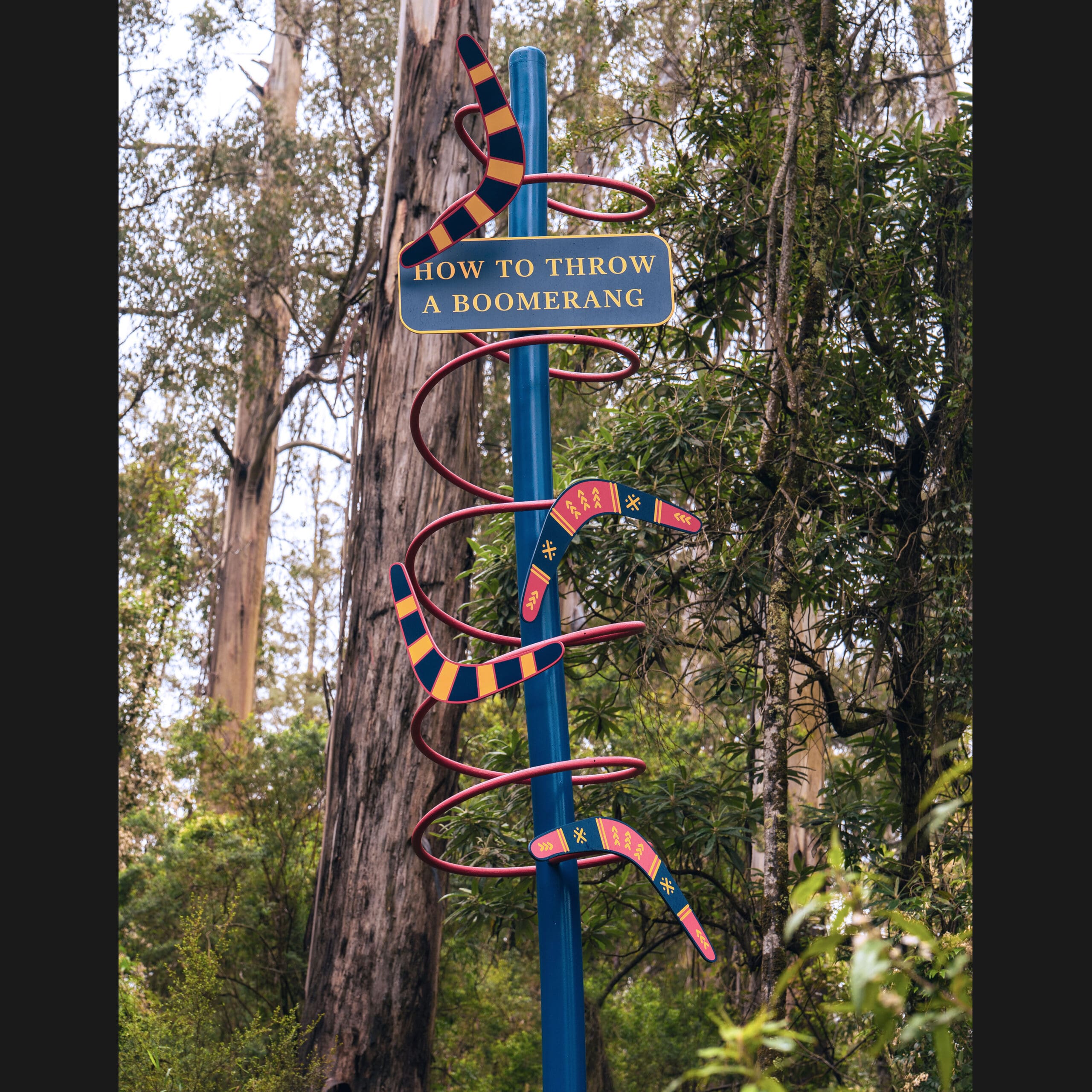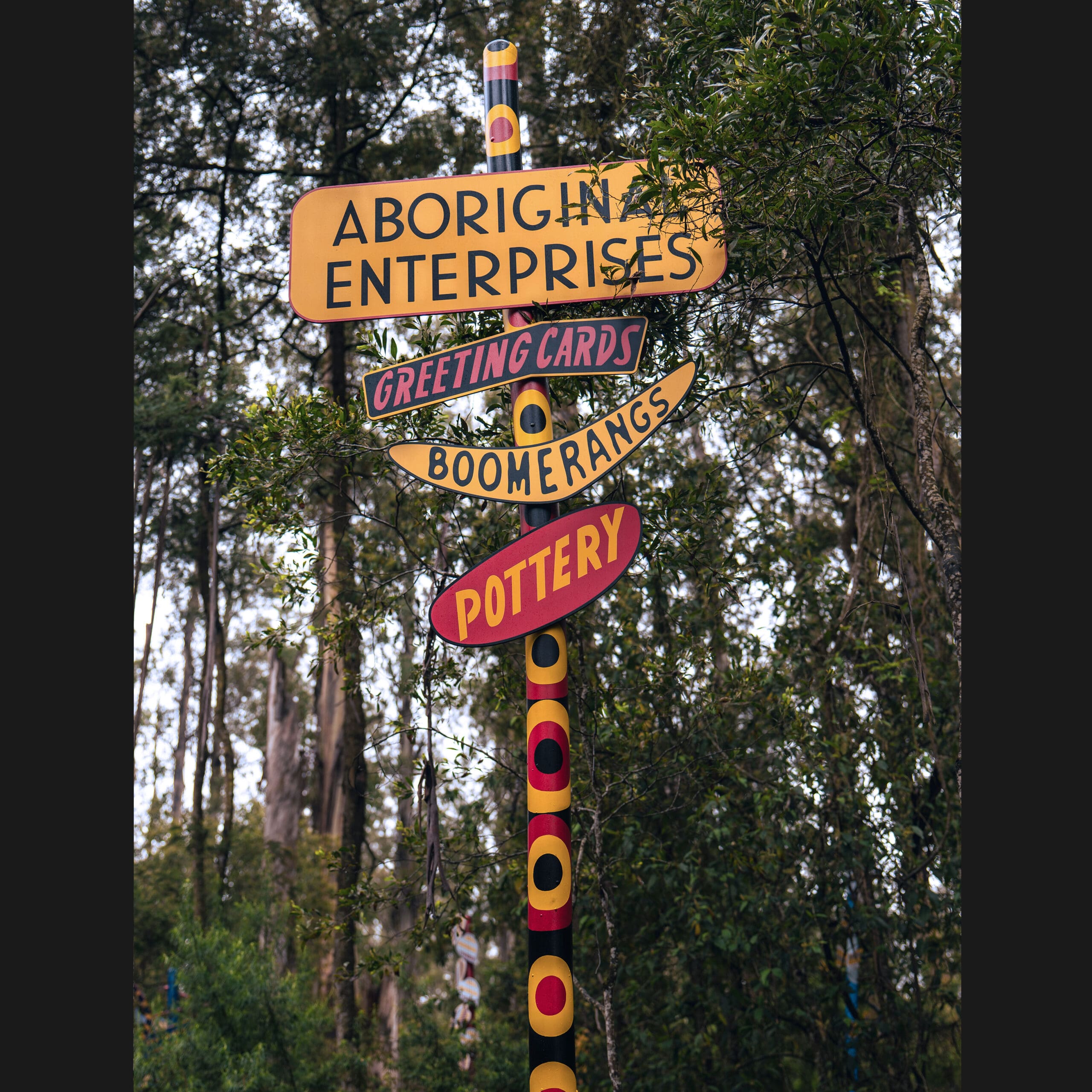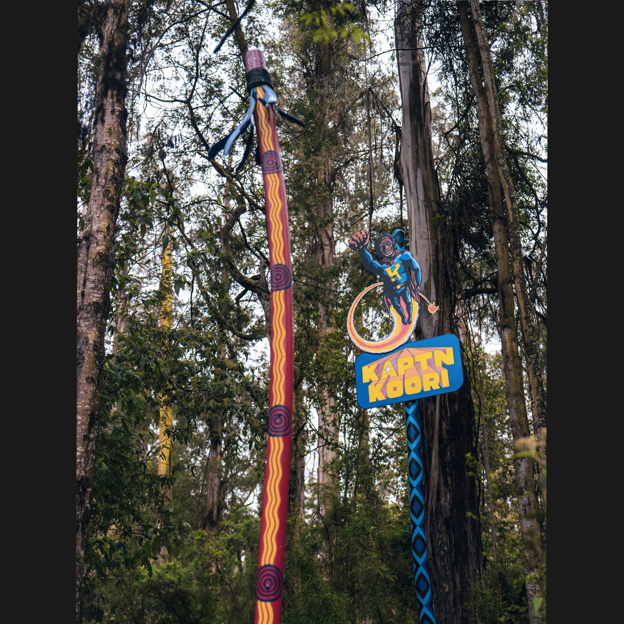 This powerful, site-responsive installation weaves together four generations of family history, activism, and creative expression that have taken place here in goranwarrabil (the Dandenong Ranges). Central to the installation are a series of sculptural signposts, each embodying a significant theme—Aboriginal Enterprises, land rights, cultural knowledge (like boomerang-throwing), ecological connections (flora, fauna, water), and Aboriginal identity. The final pole, left intentionally blank, symbolises an unwritten future, inviting reflection and a sense of possibility as well as acknowledging the next generation of the Onus family.