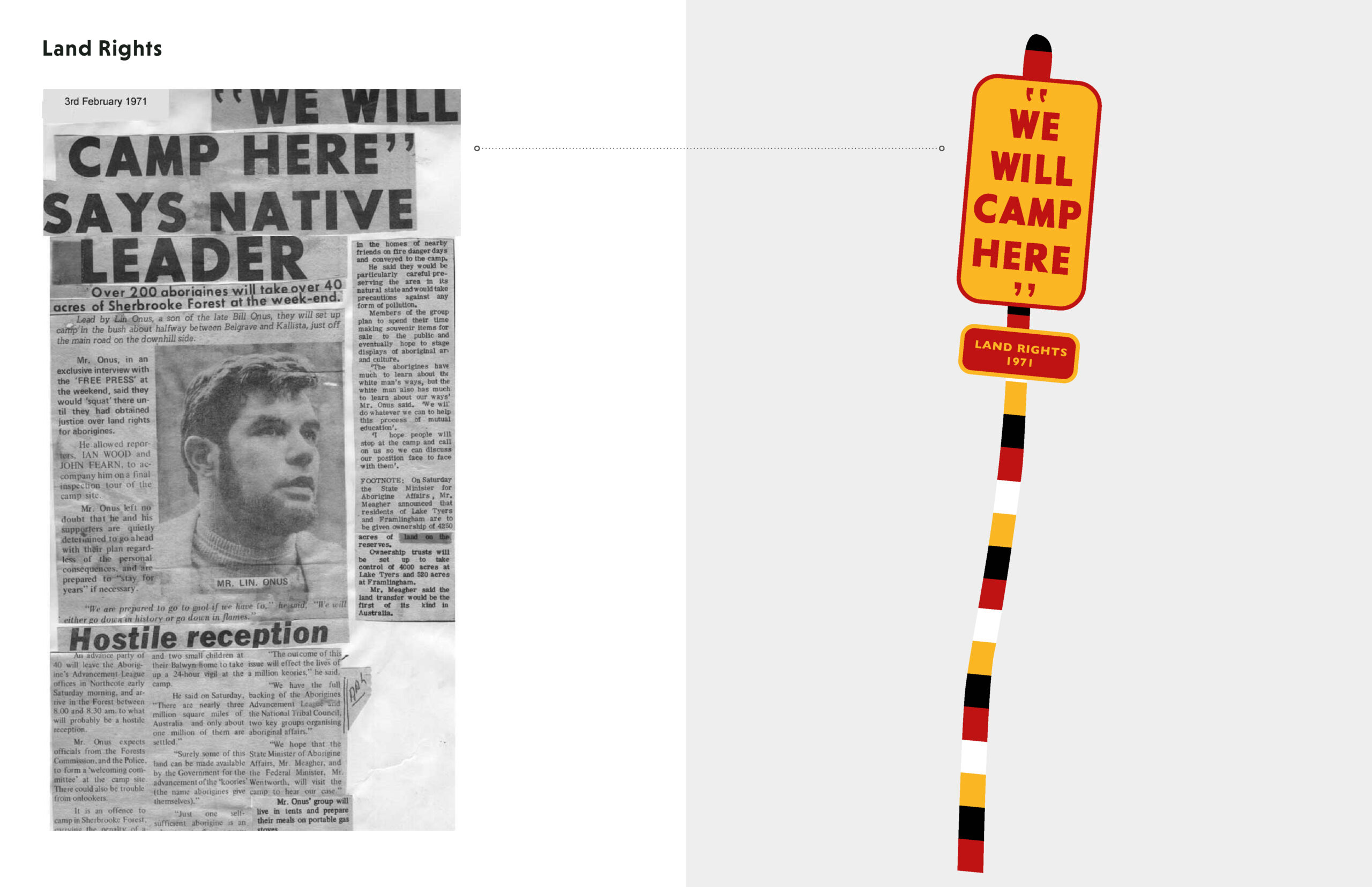 The installation also celebrates the life and artistic evolution of Lin Onus, whose pioneering fusion of Aboriginal and European artistic traditions addressed both political and aesthetic themes. The work also references Lin’s organisation of the first ever forced land rights claim in February 1971, which took place nearby in the Sherbrooke Forest.