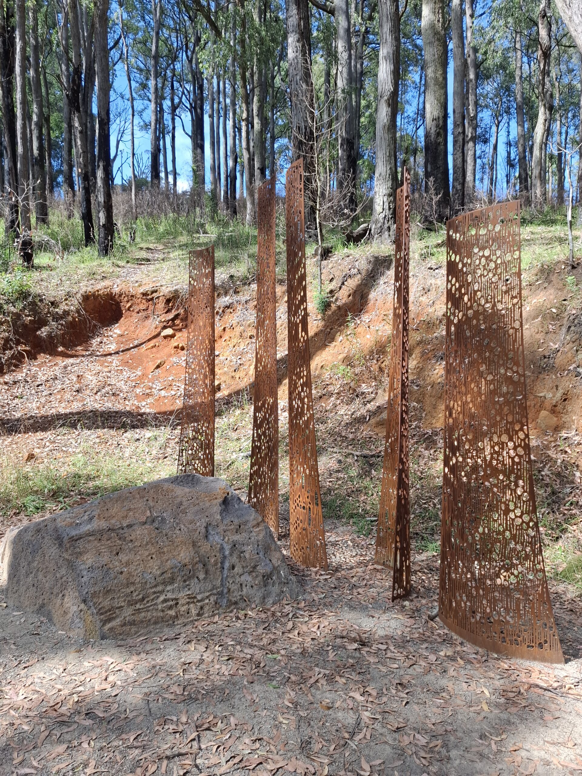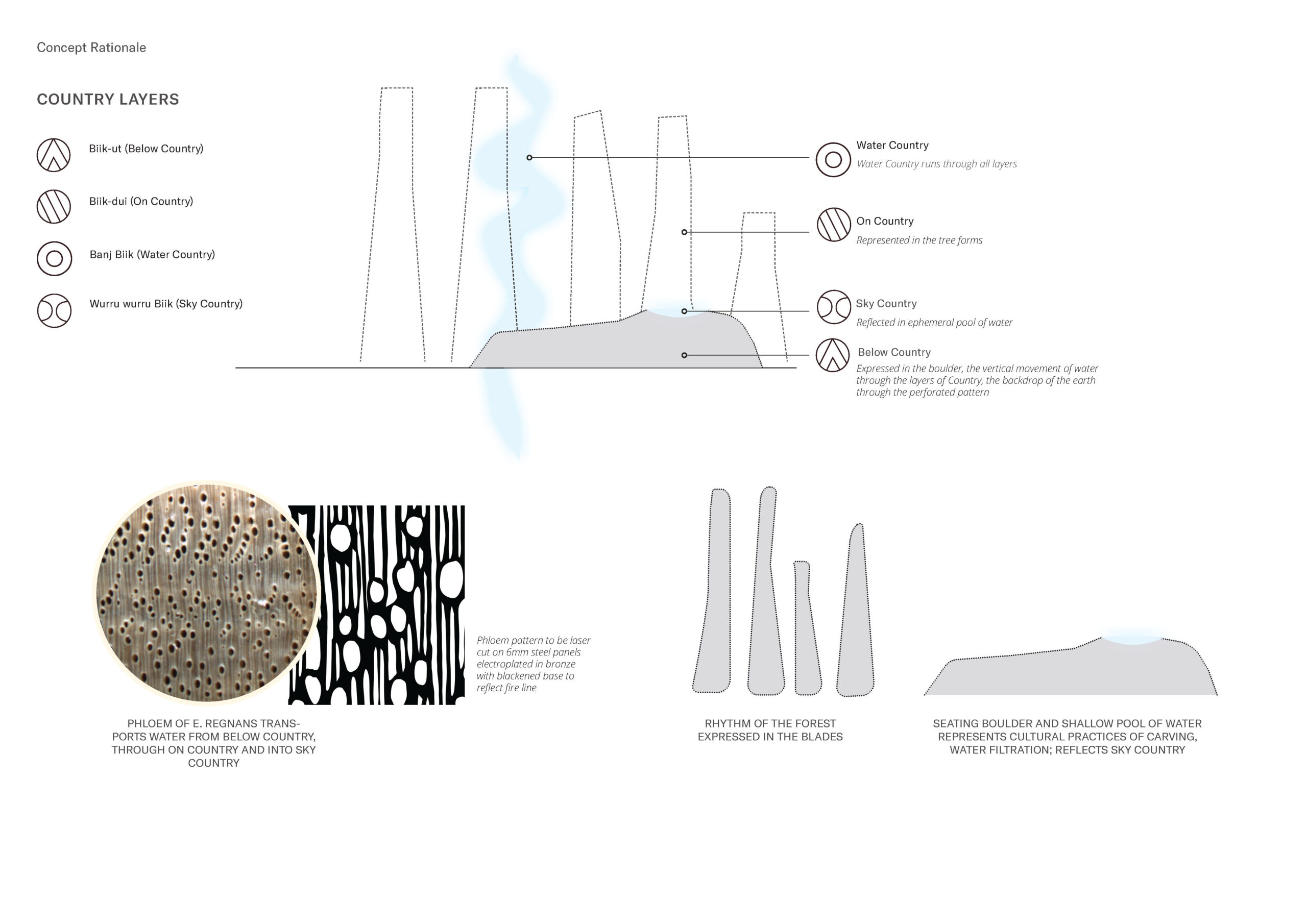 The Ways of Seeing Node is an expression of the rhythm of the forest and the movement of water through the layers of Country. Here, the phloem of the Mountain Ash is honoured as conduit of water from Biik-ut (Below Country) through Biik-dui (On Country) and into Wurru wurru Biik (Sky Country). Baanj Biik (Water Country) is honoured as an ephemeral presence, reflecting Sky and Star Country when it pools in the boulder.