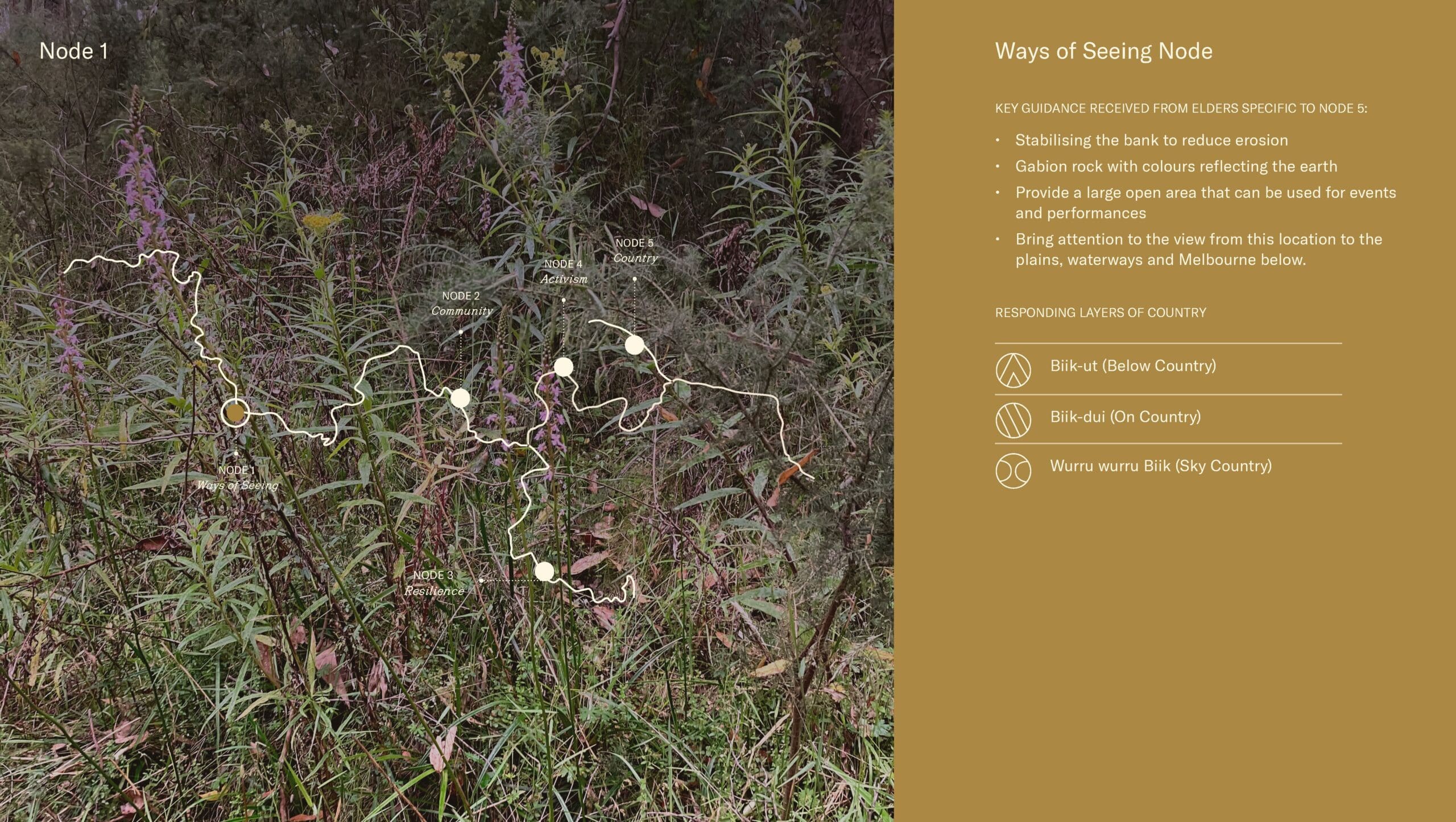 The ngurrak barring Architectural Nodes are collaborative explorations of the themes of the walk through an Indigenous lens, crafted by First Peoples design studios, Djinjama and COLA Studio.